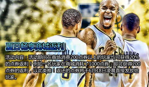 活动内容:活动期间在商城消费200点券以上的玩家均可获得20%的点券返利!例如一名玩家在商城消耗了1000点券,即可获得200点券的返利,以此类推!返还的点券将于6月18日凌晨直接发放给玩家。