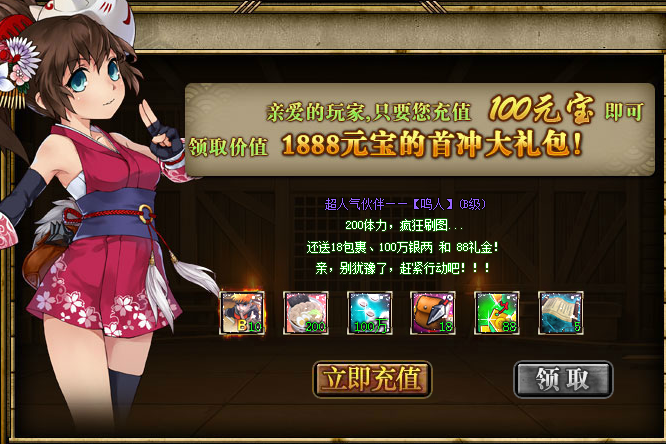 在游戏中充值任意金额可获得价值1888元首充礼包一份