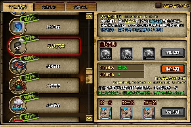 活动说明:通过变身术累计增加经验值最多的玩家获得珍宝奖励,如果成绩相同则按时间先后顺序排列