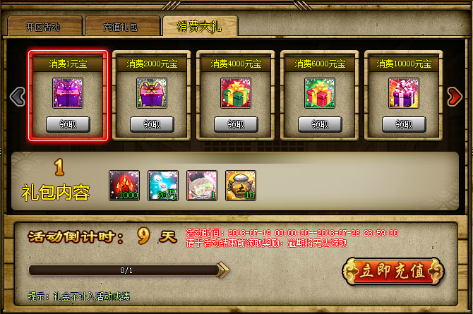 活动玩家累计充值金额满足条件即可领取限时礼包,累计充值达标高级奖励后,低级奖励也可领取。
