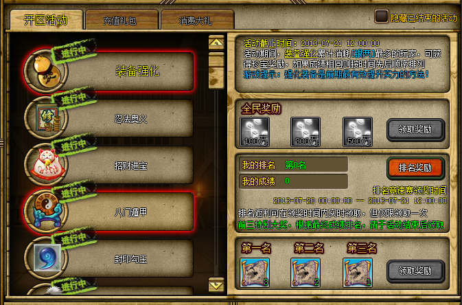 活动说明:装备强化消耗银两最多的玩家,可获得珍宝奖励