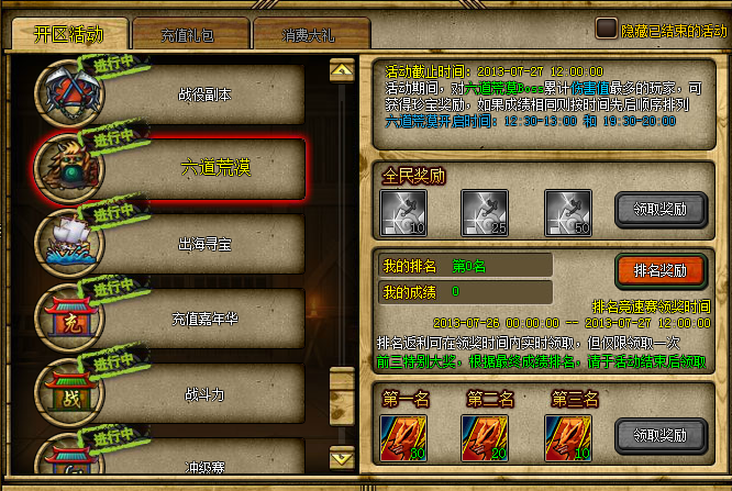 活动说明:对六道荒漠Boss累计伤害值最高的玩家,可获得珍宝奖励