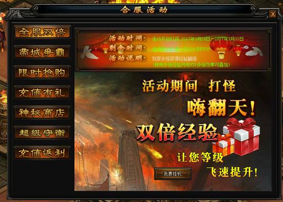 活动内容:活动时间内全服开启双倍经验,并且可以和双倍经验叠加,挂机升级内功的朋友们可以配合双倍经验卷轴。效果更佳。