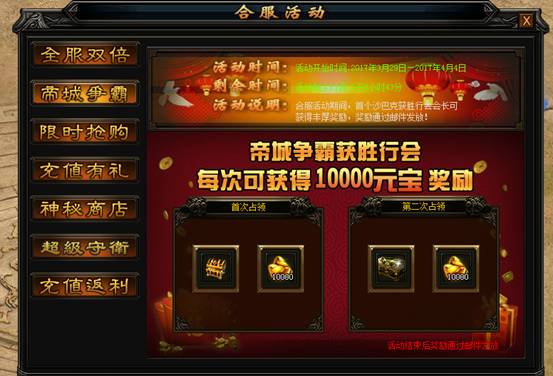 活动内容:合服后的第三天会进行第一次攻城,首个帝城城主将会获得劲爆奖励。第二次占领者奖励更强。只有最强的公会才能拿到如此殊荣。