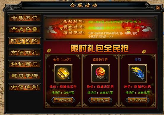 限时礼包第二天就会更新,3天后就会消失。需要的兄弟们抓紧了。本活动只有合服的时候才会出现。