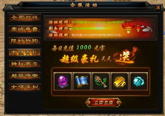 活动内容:活动期间只要充值1000元宝就能免费领取大礼。