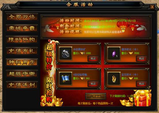 活动内容:神秘商店每隔一段时间就会刷新出一批超值商品。部分原来必须用元宝购买的商品,也会通过绑元或者金币来购买。还有一定几率会出现5折的特价商品。