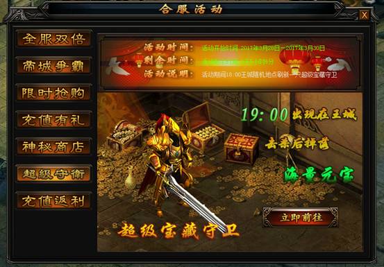 活动内容:超级宝藏守卫随机刷新在主城某个位置。击杀后掉落海量元宝。数量之多绝对超乎你的想象。