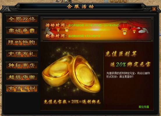 活动内容:兄弟们只要充值就会立刻得到20%的绑元返利。冲的多,送的多。