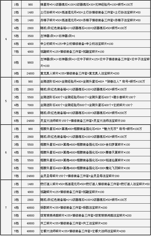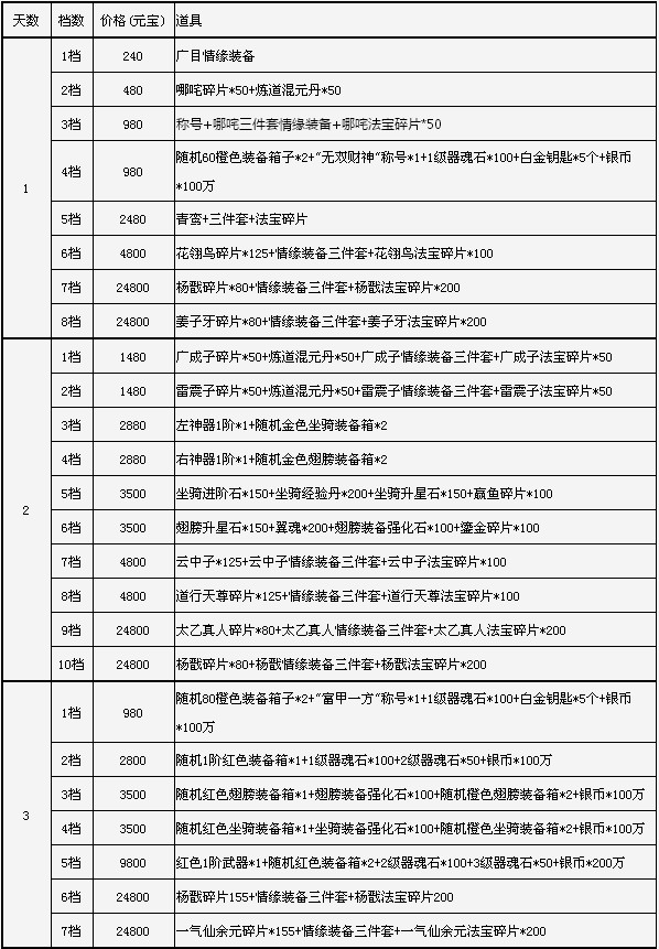 开服第七天:铸兵魂器*30,坐骑经验丹*10,招募令*10,白金钥匙*10,2级单属性宝石袋*1