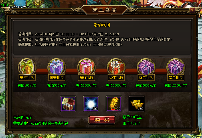 参与条件:玩家只要充值和消费达到相应礼包的要求,就可以购买6个阶梯的大礼包。