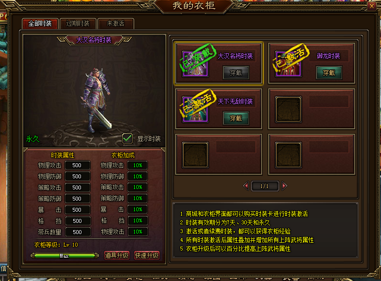 4.购买或续费时装都可以增加衣柜经验,衣柜升级可以百分比提高所有上阵武将的属性