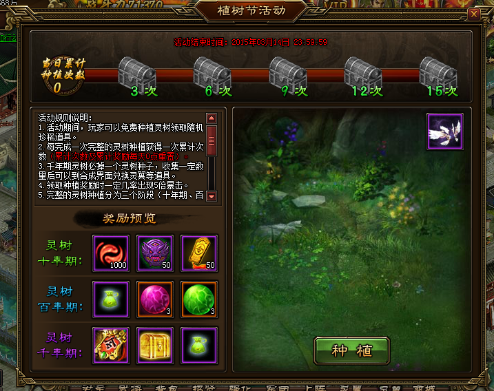 1) 活动期间内,玩家可以免费种植灵树,灵树的成长分为三个阶段(十年期、百年期、千年期),每个阶段完成后可领取对应的随机珍稀道具奖励;
