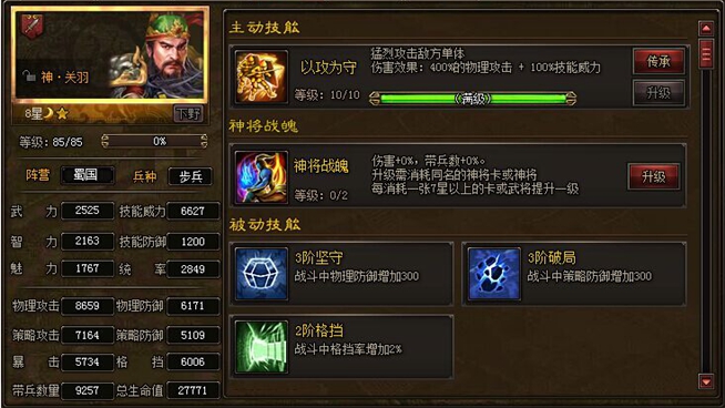 神将关羽:英勇骁战,善于谋略。温酒斩华雄,于千军万马中取颜良文丑之首,闯关斩将,单刀赴会,罾口川淹七军