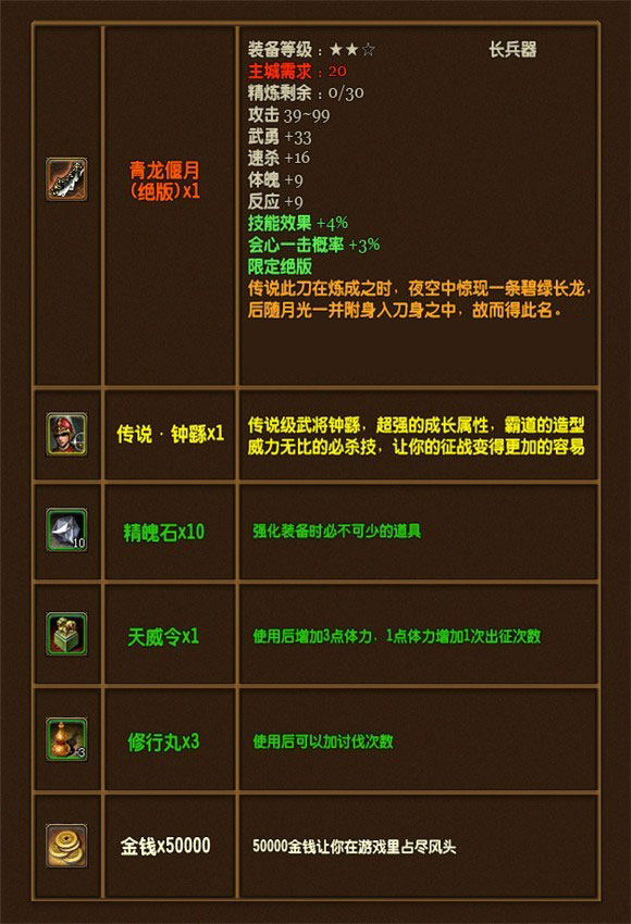 只要你是等级狂人,只要你敢挑战,我们就敢送你青龙偃月刀,配合关羽武将,让你驰骋天下。