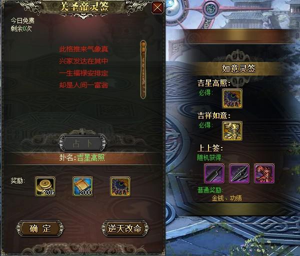 所有玩家每天拥有1次免费的卜卦机会,另外可以花费5通宝换取1次卜卦的机会,换取次数不限。如果玩家对卜卦的结果不满意,还可以通过“逆天改命”功能升级卦签,从而获得更高的奖励,逆天改命改变卦象,成功则提升1级卦象,失败保持不变。