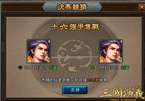 内行看门道,外行看热闹。虽说作为普通玩家的我们不能像那些绝顶高手一样上阵厮杀,但此等盛事又岂能独身事外?从跨服总决赛16强的每一场对抗开始,每位玩家都可以在比赛前参与胜负的竞猜。如果猜中了获得胜利的玩家,就能获得15点荣誉值的奖励。崇拜强者乃是人之天性,相信每一位参赛的大神,背后都拥有数目庞大的粉丝团。来自各服务器的童鞋们,赶紧为你所支持的高手们加油助威吧!在你们的不懈支持下,诸位绝顶高手们定能精神抖擞全力发挥,为大家奉献一场又一场荡气回肠的史诗对决!震古烁今的跨服决战,有你更精彩!