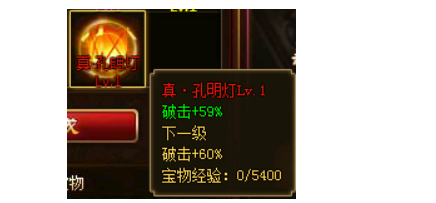 本期超强宝物-真·孔明灯,1级提升59%破击,帮助玩家打出更高的伤害。目前游戏内最强破击宝物!