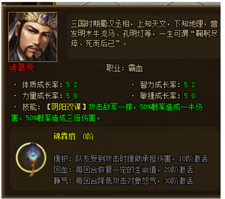技能【阴阳双谋】攻击敌军一排,50%概率造成一半伤害,50%概率造成三倍伤害。