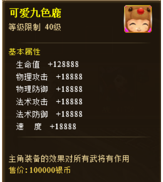 30000 | 30000金币,10级银币包*1000,镇魔资质丹*300,1级隐龙珠*2000,可爱九色鹿(时装) |