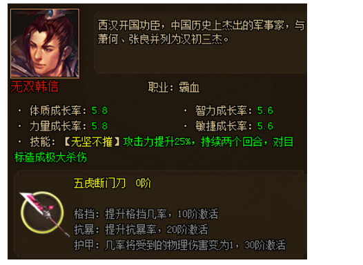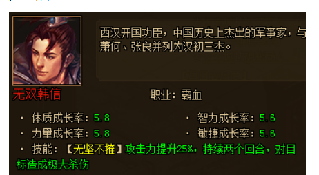本周更新:全新武将超强神将“无双韩信”,技能提升25%攻击力持续两个回合,并且对目标造成极高伤害。