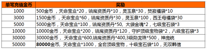 活动内容:活动期间,游戏内开启单笔充值活动,玩家每单笔充值一定金额,即可获得相应的充值奖励。