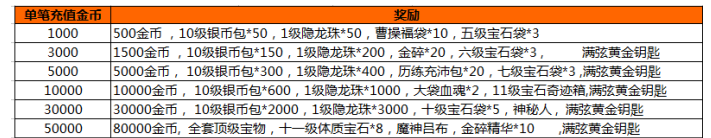 活动内容:活动期间,游戏内开启单笔充值活动,玩家每单笔充值一定金额,即可获得相应的充值奖励。拥有满弦黄金钥匙,可以前往活动使者直接购买曹操礼包。