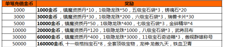 活动内容:活动期间,游戏内开启单笔充值活动,玩家每单笔充值一定金额,即可获得相应的充值奖励。