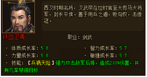 武将卫青技能:强攻敌军后排,造成巨大伤害,并有机会禁锢目标。