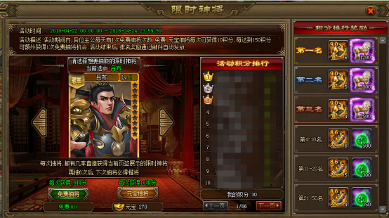 活动期间,各位主公每天有一次免费抽奖次数。免费及元宝抽将每次可获得10积分,计算入积分排行帮,参与获得积分排行奖励,且每达到150积分可额外获得1次免费抽将的机会。