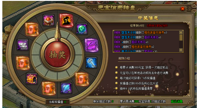 活动期间,玩家每消耗300元宝,即可获得一次转盘次数,每次转动转盘,100%获得一次精彩奖励,幸运值达到100点,必定获得极品道具奖励一份。