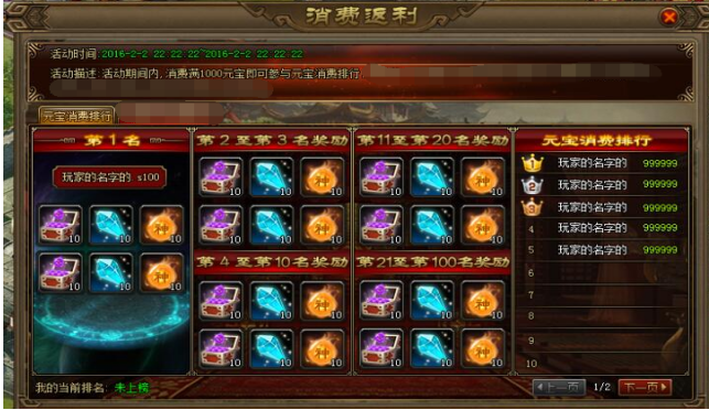 【活动内容】活动期间,玩家消费满2000元宝,便可参加元宝消耗排行榜。活动结束后排行榜奖励将会通过系统邮件自动发放。(活动UI参考,具体以游戏中活动为主)