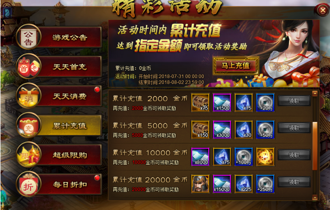 活动内容:活动期间累计充值达到指定金额即可领取丰厚奖励,强力推荐新技能。