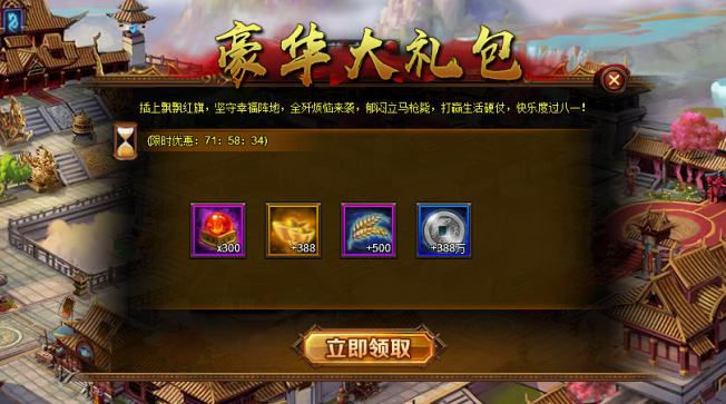 活动内容:活动期间登录游戏即可领取豪华大礼包一份。