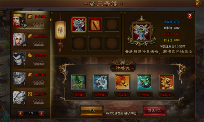 活动内容:活动期间可通过奇遇一次或奇遇十次神兽魂魄,收集神兽魂魄达到要求可获得金色装备或金色技能。