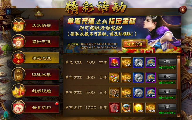 活动内容:活动期间单笔充值达到要求即可领取丰厚奖励。