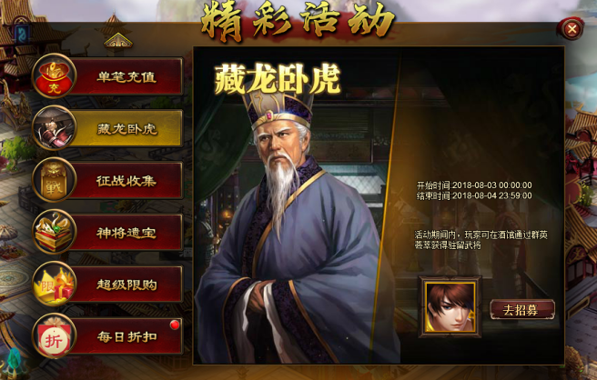 活动内容:活动期间酒馆限时驻留金色武将姜维,PVP强力推荐。