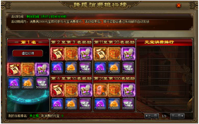 【活动内容】活动期间,玩家消费满2000元宝,便可参加元宝消耗排行榜。活动结束后排行榜奖励将会通过系统邮件自动发放。