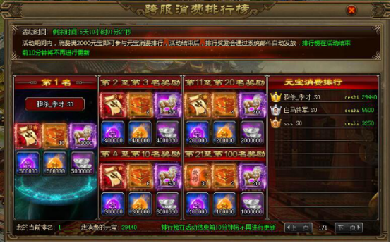 【活动内容】活动期间,玩家消费满2000元宝,便可参加元宝消耗排行榜。活动结束后排行榜奖励将会通过系统邮件自动发放,排行榜在活动结束前10分钟将不再进行更新。(活动参考UI,以游戏中为准)
