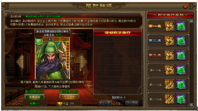 【活动内容】活动期间,各位主公每天有一次免费抽奖次数。免费及元宝抽将每次可获得10积分,计算入积分排行帮,参与获得积分排行奖励,且每达到150积分可额外获得1次免费抽将的机会。(活动参考UI,具体以游戏中为准)