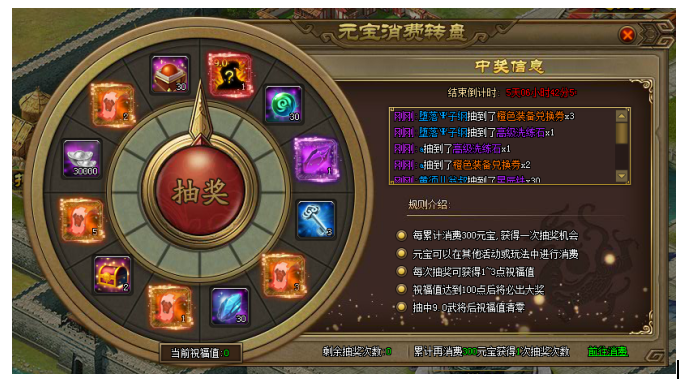 【活动内容】活动期间,玩家每消耗300元宝,即可获得一次转盘次数,每次转动转盘,100%获得一次精彩奖励,幸运值达到100点,必定获得极品道具奖励一份。(活动参考UI,具体以游戏中为主)