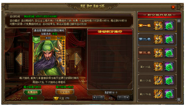 【活动内容】活动期间,各位主公每天有一次免费抽奖次数。免费及元宝抽将每次可获得10积分,计算入积分排行帮,参与获得积分排行奖励,且每达到150积分可额外获得1次免费抽将的机会。(活动参考UI,具体以游戏中为主)