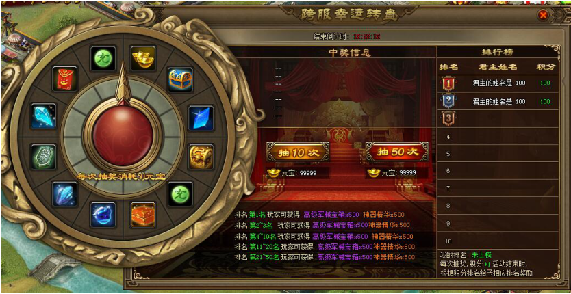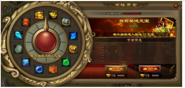 【活动内容】活动期间,玩家每次抽奖消耗30元宝,每次抽奖将会有10元宝注入奖金池,玩家每次转动可以有机获得活动奖金池的10%奖金,25%奖金,50%奖金,100%奖金元宝。(活动参考UI,具体以游戏中为主)