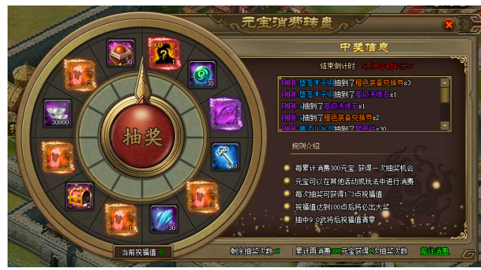 【活动内容】活动期间,玩家每消耗300元宝,即可获得一次转盘次数,每次转动转盘,100%获得一次精彩奖励,幸运值达到100点,必定获得极品道具奖励一份。(活动参考UI,具体以游戏中为主)