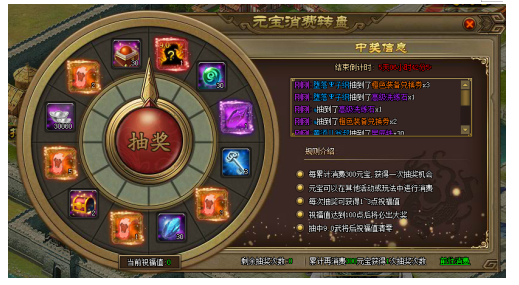 【活动内容】活动期间,玩家每消耗300元宝,即可获得一次转盘次数,每次转动转盘,100%获得一次精彩奖励,幸运值达到100点,必定获得极品道具奖励一份。(活动参考UI,具体以游戏中为主)