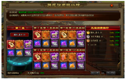 【活动内容】活动期间,玩家消费满2000元宝,便可参加元宝消耗排行榜。活动结束后排行榜奖励将会通过系统邮件自动发放。(活动参考UI,具体以游戏中为主)