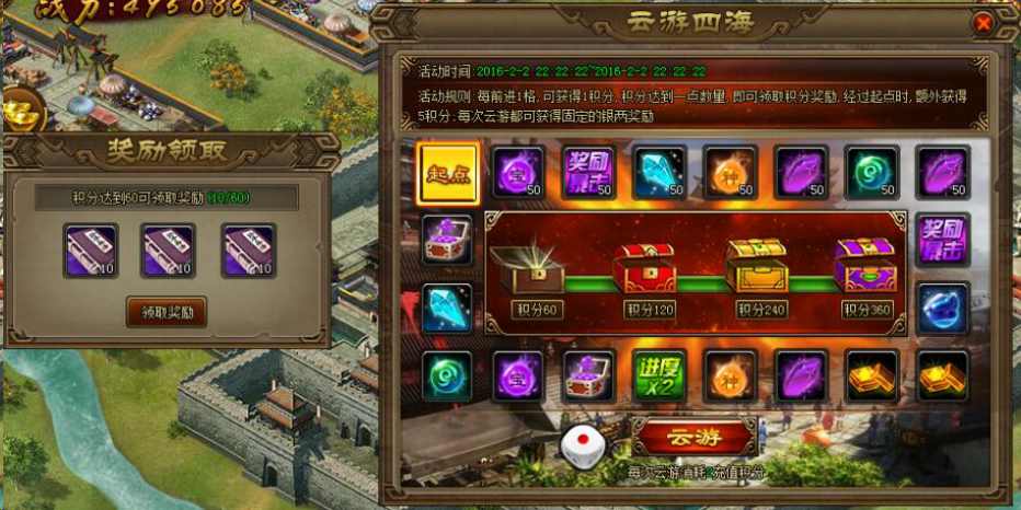 【活动内容】活动期间,每消耗100元宝获得一次云游机会,玩家每前进一格,即可获得一个云游积分,积分达到一定数量,即可领取积分奖励,经过起点时候额外获得5积分奖励,每次云游都可获得固定的银两奖励!(活动参考UI,具体以游戏中为主)