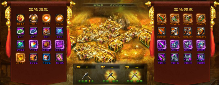 【活动内容】活动期间,每天可免费挖宝3次,还可以花费元宝连挖,获取大量奖励哦!(活动参考UI,具体以游戏中为主)