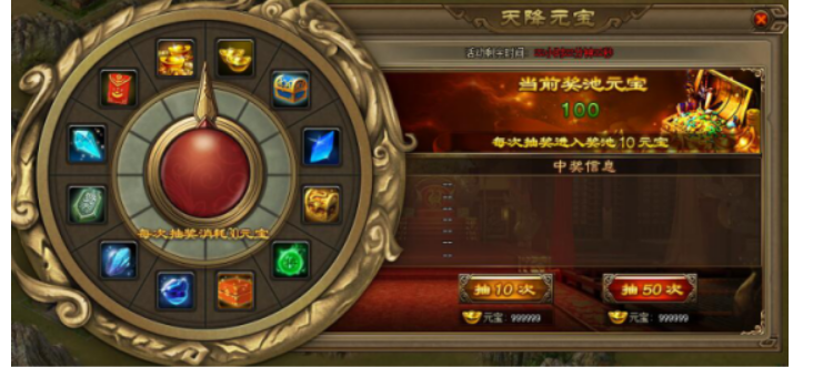【活动内容】活动期间,玩家每次抽奖消耗30元宝,每次抽奖将会有10元宝注入奖金池,玩家每次转动可以有机获得活动奖金池的10%奖金,25%奖金,50%奖金,100%奖金元宝。(活动参考UI,具体以游戏中为主)
