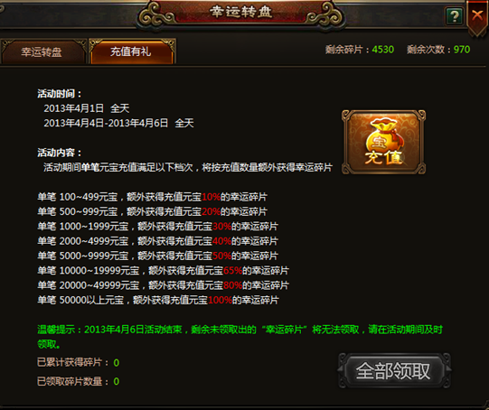 3、2013年4月6日 24点活动结束后,所有剩余未领取的幸运碎片将无法领